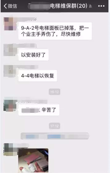 物業打電話給電梯維保公司,反映電梯操作箱面板已掉落,把個業主手弄傷了,且把手指受傷的圖片發給了電梯公司。